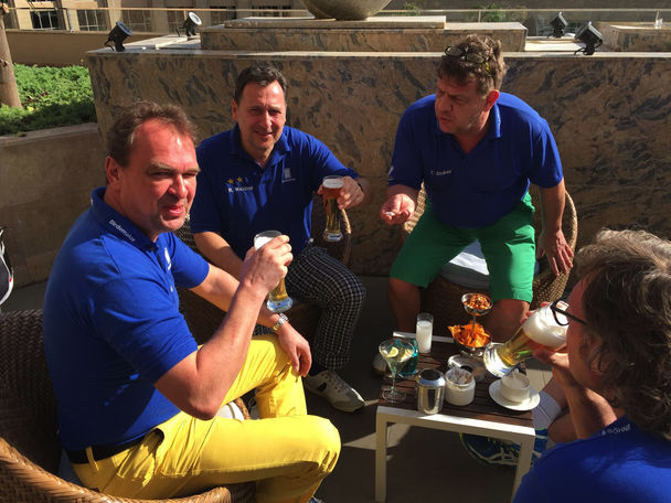 Nach der Rückkehr ins Hotel haben wir uns alle in der Brasserie zu einem kleinen Imbiss getroffen. Gleich nach der Stärkung wurde den Rules entsprechend der Pokal vom letztjährigen Belektrophy-Sieger HC-Bester an den neuen und erstmaligen Belektrophychampion Sir Fifty Lange übergeben. Es war in der gesamten Geschichte der Titans die Entscheidung mit dem größten Punkteabstand. Dieser Umstand drückt die Überlegenheit vom Sir Fifty Lange in dieser Saisoneröffnungswoche am Besten aus. Mit Blick auf den Zwischenstand der Titanstrophywertung erhoffen sich alle Beteiligten einen etwas spannenderen Verlauf der anstehenden Wettkämpfe. Die anschließende, kleine Diskussion über die eine oder andere Spielweise führte zu einem etwas unübersichtlichen Konsum von diversen Getränken. Das wiederum führte beim Verlassen der Örtlichkeit zu einer Kollision von Ernie mit Tragebag vs. zweier Eingangsflügeltüren. Durch diese elementare Erschütterung sprangen einige Golfbälle quer durch das Kaya Palazzo Golf Hotel. Aber unser Ernie hat die Bälle mehr oder weniger geschmeidig alsbald wieder in seinem Bag verstaut. Die Titans haben sich dann zurückgezogen um sich auf das Abendessen vorzubereiten und ihre Sachen für die morgige Heimreise zu packen. Leider müssen wir hier auch noch mitteilen, dass unser Birdiemaker beim Besuch des Hamams ausgerutscht ist und sich wahrscheinlich den Zeigezeh gebrochen hat. Diese Solidarität mit dem HC-Besten sucht seinesgleichen. Die Krücken werden somit einer neuen Bestimmung zugeführt. Gute Besserung! Zum Abendessen waren bis auf Ernie Weidner auch alle pünktlich anwesend. Nach einer halben Stunde wurde dieser aber mit einem Weckruf in die vertraute Runde zurückgeholt. Kaum hatten wir das letzte Abendmahl abgeschlossen, ging es in die heute total überfüllte Stamm-Cigar-Bar. Dort gab es neben den bereits gewohnten Getränkefolgen das CL-Spiel Juve vs. Bayern mit den beiden Fachkommentatoren Stuber/Hlavnicka zu sehen. Sie sind weltweit für ihre objektive und vor allem neutrale Bewertung bekannt. Wir werden hier den Abend ausklingen lassen und verabschieden uns hiermit von den Besuchern dieser Seite mit einem dreifachen